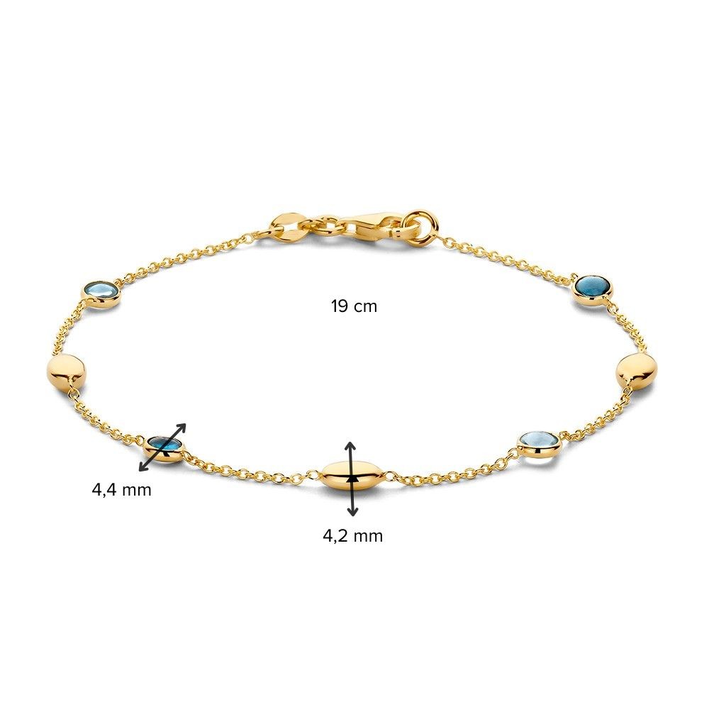 Geelgouden armband met blauwe topaas en london blue topaas. De kleurstenen worden afgewisseld met gouden elementen voor een speelse uitstraling.