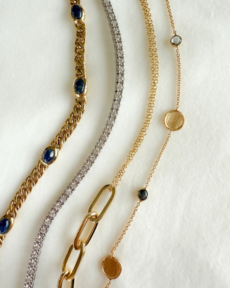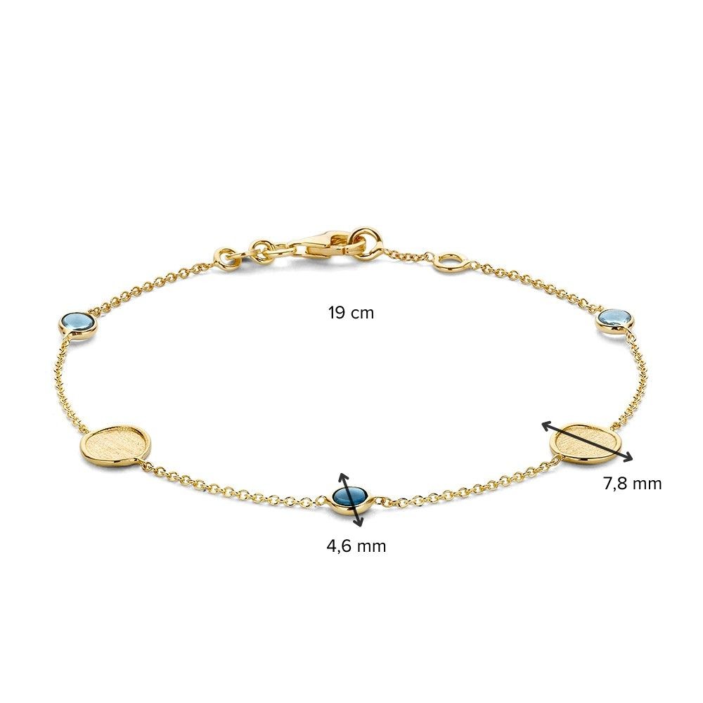 Speelse, 14kt gouden armband met topaas en london blue topaas. De armband bevat bovendien matgouden elementen die eventueel voorzien kunnen worden van een (letter)gravure.