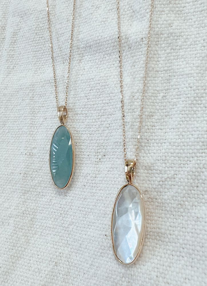 Geelgouden ketting met ankerschakel en prachtige ovale hanger gezet met een gefacetteerde aquamarijn.