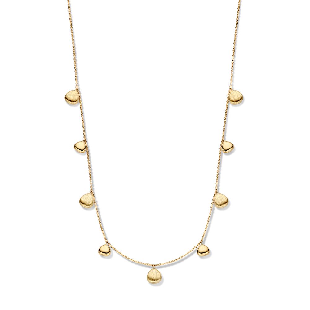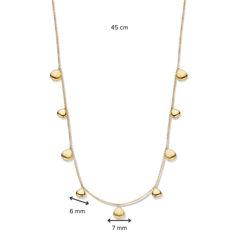 Speels geelgouden collier met ovale elementjes in gematteerde en gepolijste uitvoering.