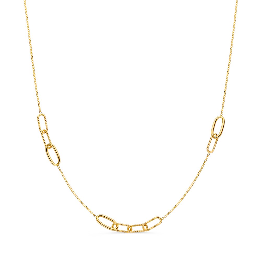 Speels, geelgouden collier met paperclipschakels met een getorste bewerking.