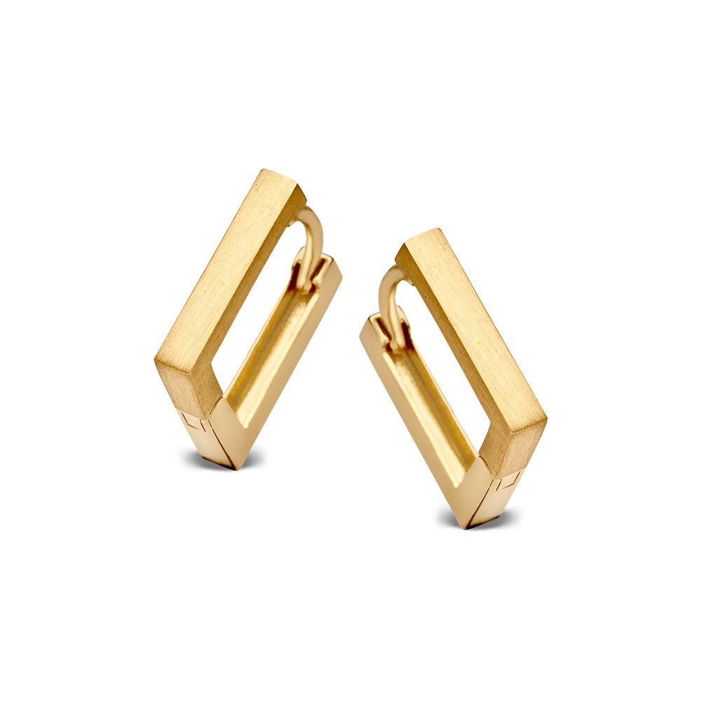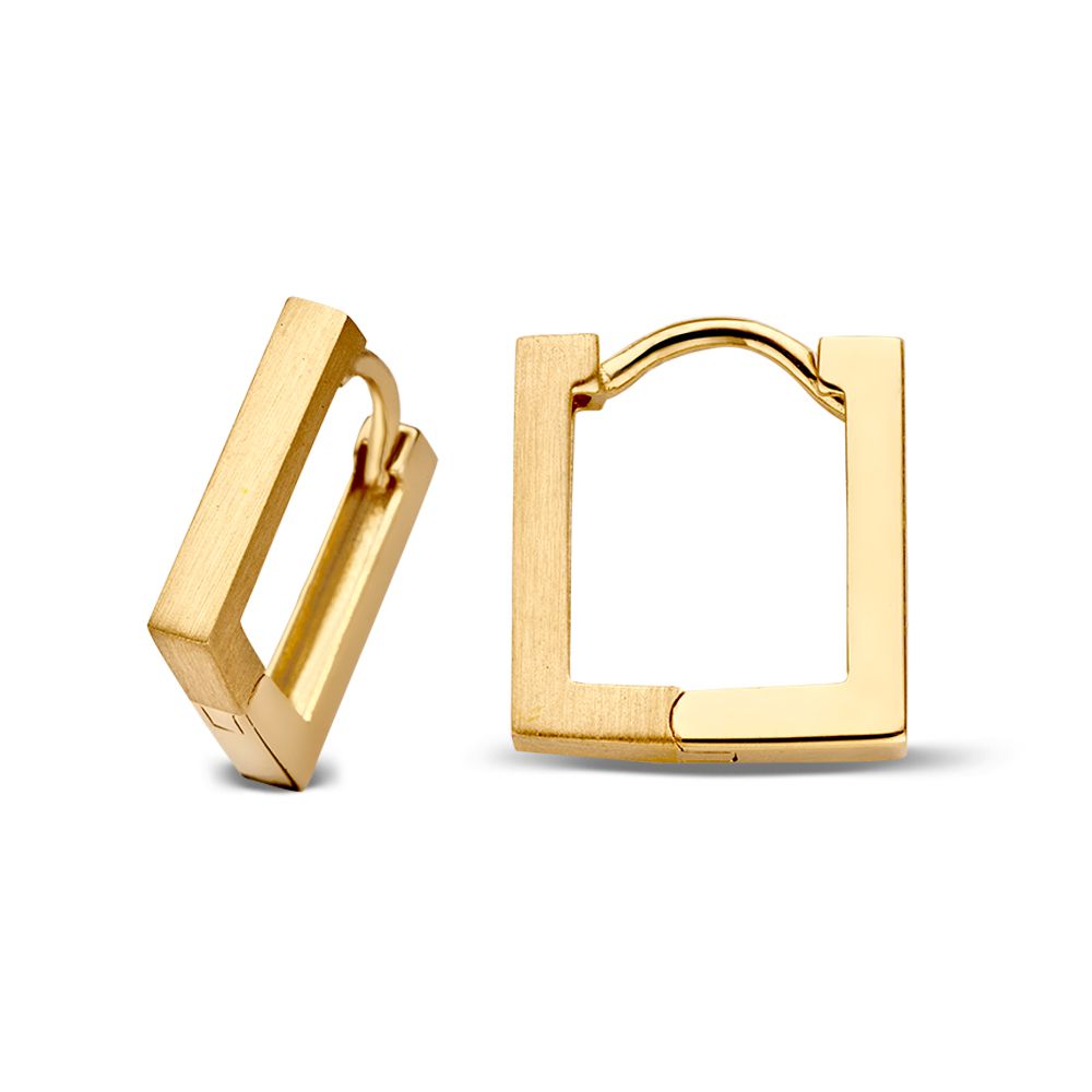 Geelgouden oorringen met vierkant design. De oorbellen zijn aan een zijde mat afgewerkt en aan een zijde glanzend, je kunt hiermee gemakkelijk wisselen van stijl.