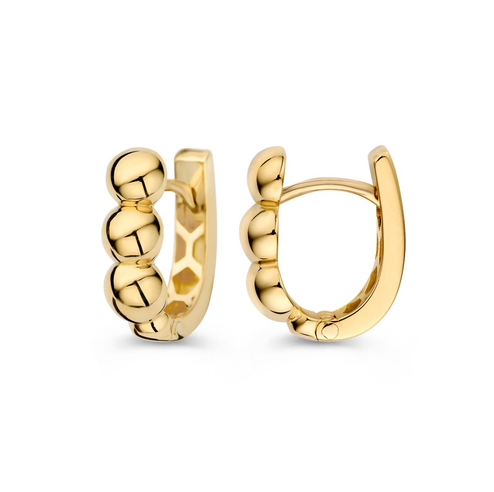 Opvallende, gouden oorringen aan de voorzijde bewerkt met een bolletjespatroon.