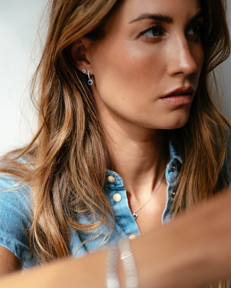 Witgouden oorringen met saffier aanhangers.