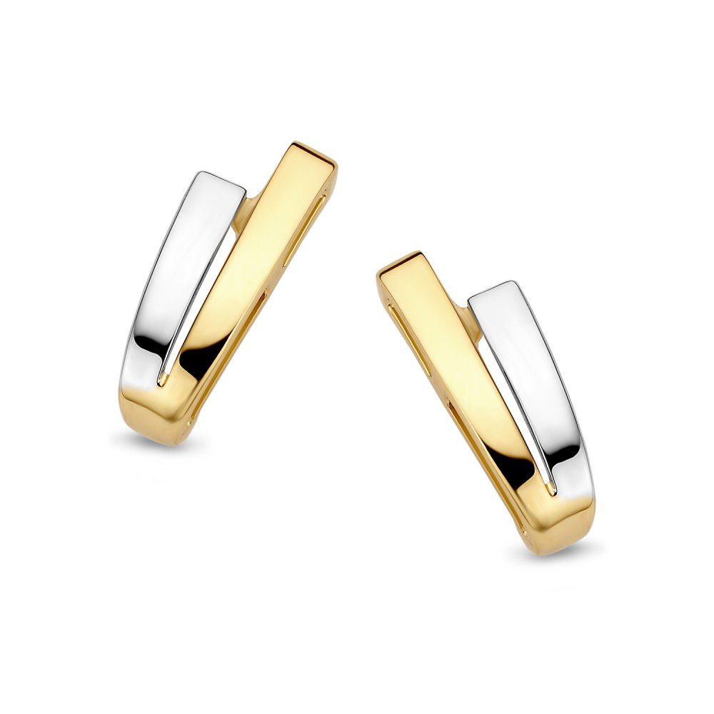 Bicolor gouden oorstekers in strakke uitvoering.
