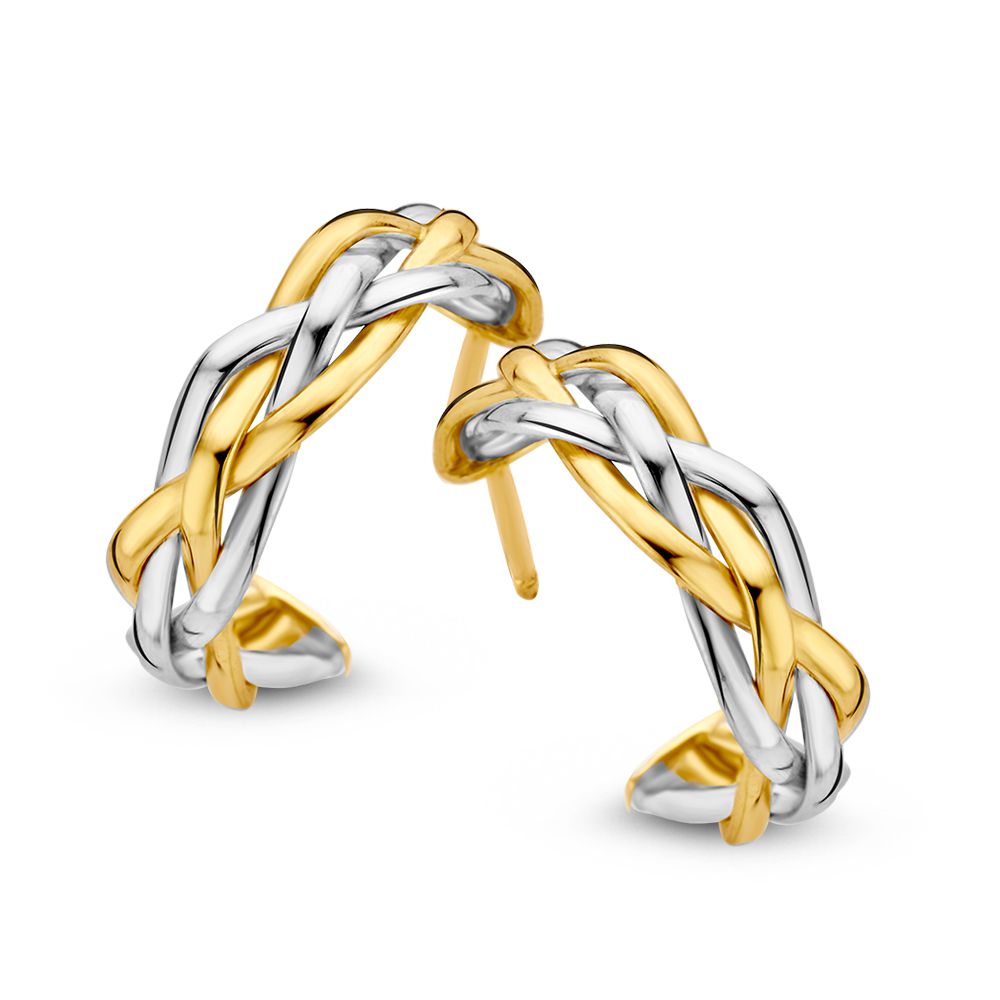 Bicolor gouden oorringen met steker, gevlochten banen.