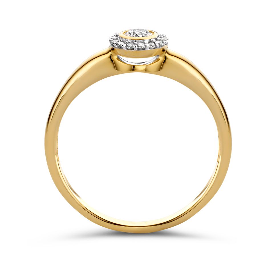 Geelgouden entourage ring met diamant. Het is mogelijk de ring te combineren met andere (rij)ringen.