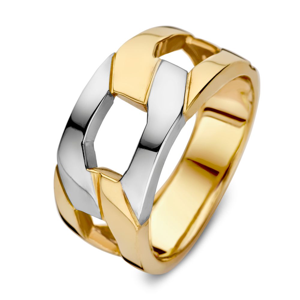 Brede statement ring in bicolor wit- en geelgouden uitvoering. De strakke, vlakke schakel geven deze ring een unieke uitstraling.