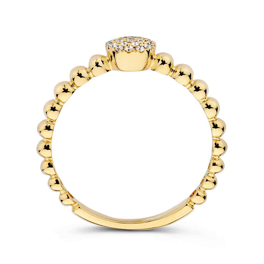 Geelgouden bolletjes ring met een rond middenstuk gezet met fonkelende diamanten.