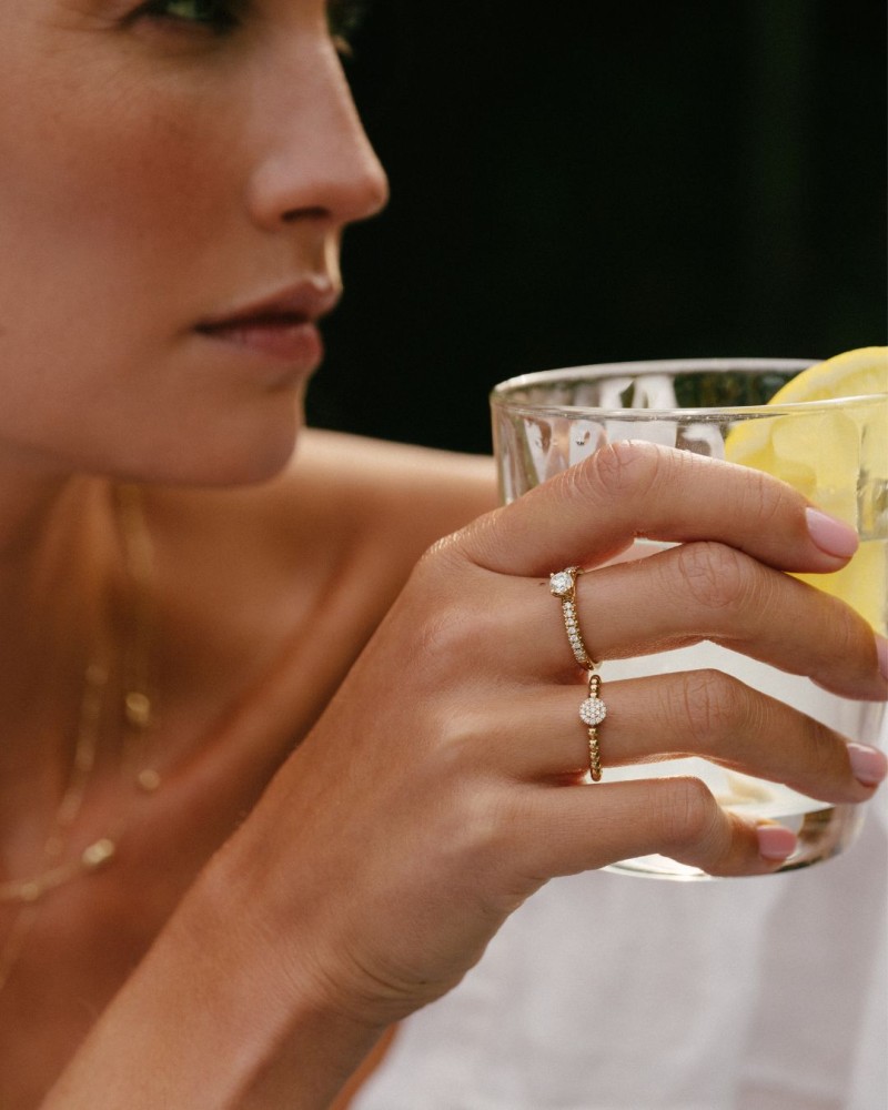 Geelgouden bolletjes ring met een rond middenstuk gezet met fonkelende diamanten.