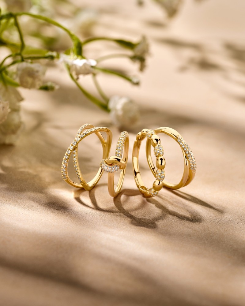Verfijnde gouden cross-over ring met diamanten in pavezetting.