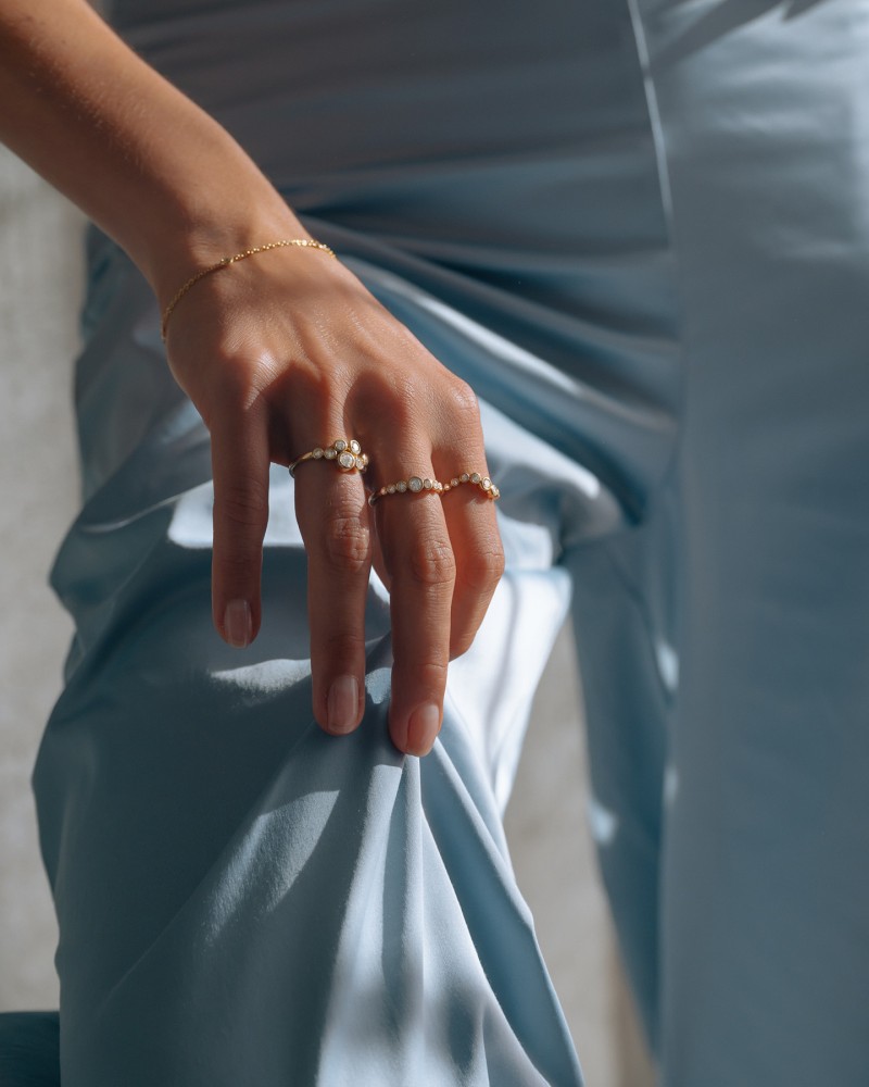 Schitterende, gouden ring uit onze 'Bubbles'-collectie, de ring is versierd met acht diamanten in stijlvolle gouden zetkastjes, speels variërend in grootte.