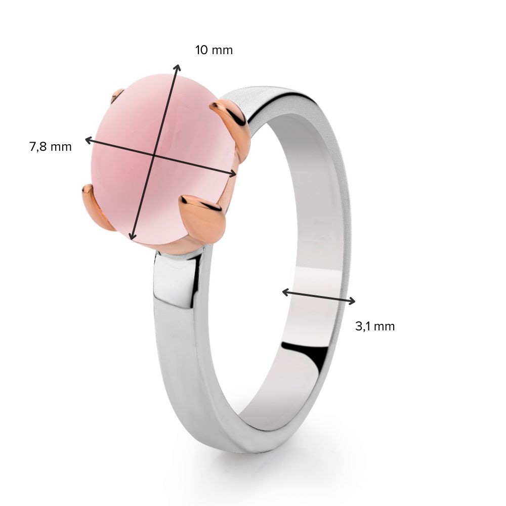Gerhodineerde, zilveren damesring met 14 karaat roségouden zetting (geen oplaag). De ring heeft een cabochon geslepen rozenkwarts als middensteen. Deze ring is perfect te combineren met onze andere Fiorella ringen.